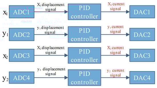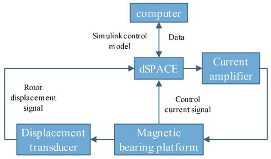 The working principle of using the dSPACE platform for control is shown in Figure 16. By using a computer, the Simulink control model is compiled and downloaded to the dSPACE system, the magnetic bearing rotor displacement signal is connected to the ADC interface of the dSPACE platform as the system’s input, and then, based on the Simulink control model, control currents are generated and output through the DAC interface to the power amplifier.