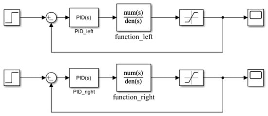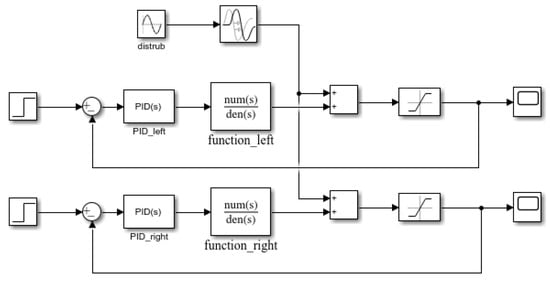 In combination with dSPACE, a control model is established using a Simulink model, with its control block diagram shown in Figure 26, where x1 represents the horizontal direction of the left HMB, y1 represents the vertical direction of the left HMB, x2 represents the horizontal direction of the right HMB, and y2 represents the vertical direction of the right HMB. The PID controller parameters for the x1 and y1 directions are as follows: = 2.029, = 73, = 1.2 × 10−5, N = 5 × 103. The parameters of the PID controller of x2 and y2 directions are = 0.41514, = 60, = 1.59 × 10−4, N = 2 × 104.