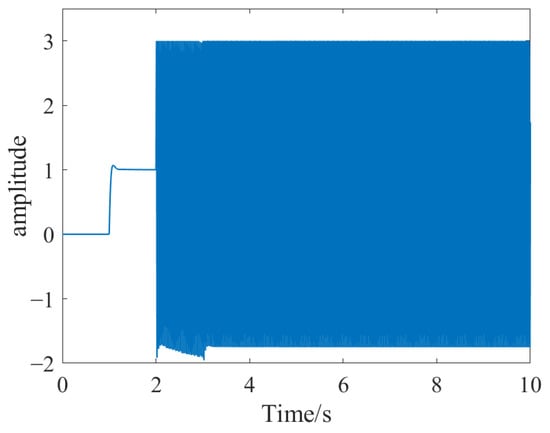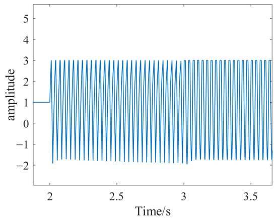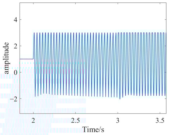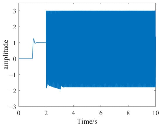 According to the control principle of the HMB system, a simulation model for the rotor fluctuation response is established, as shown in Figure 17. To avoid overloading the magnetic bearing due to excessive current, a current limiting module is incorporated into the model, with a range of . The rotor is initially stationary. The input signal is a step signal, which takes effect at 1 s with a magnitude of 1 A. A sinusoidal signal is added to simulate external disturbance forces, with an amplitude of 3 N and a frequency of 30 Hz, which takes effect after a delay of 2 s. The simulation model for the rotor response under external disturbance forces is established as shown in Figure 18.