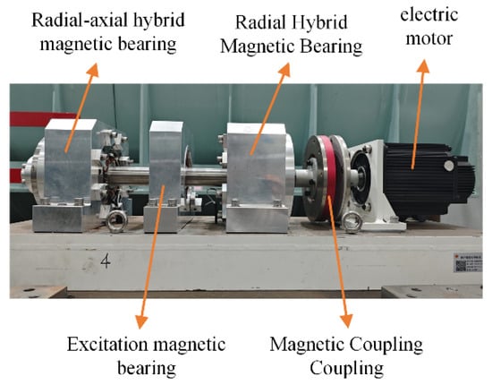 The experimental bench consists of two HMBs, one excitation magnetic bearing, a magnetic coupling, and a motor. The rotor is driven by the motor, and connected via a magnetically coupled shaft coupling, enabling the transmission of force and torque through magnetic interaction. The right side of the bench is supported by a radial-axial HMB, while the left side is supported by a radial HMB. The two radial HMBs share identical structural configurations. When the rotor is not in operation, it rests on mechanical backup bearings. During normal operation, the rotor is fully levitated by the two HMBs at both ends with no physical contact with the surroundings. The motor can adjust the rotor speed, with a speed range of 0~3000 rpm. All experiments were conducted under standard ambient temperature and pressure conditions without any special environmental requirements.