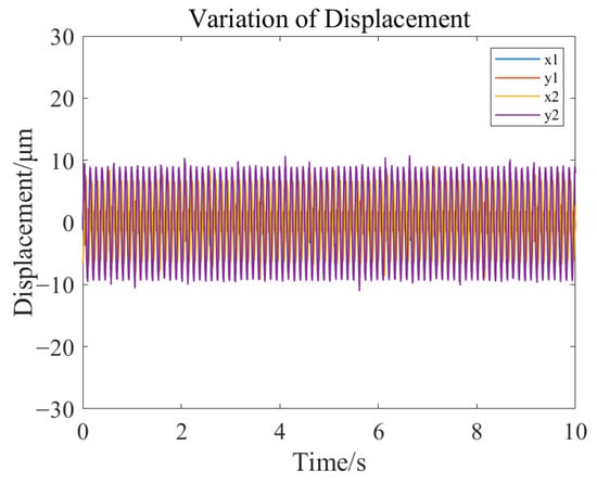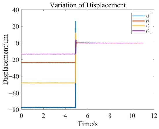 When the rotor is in a stationary state, the controller initiates operation and records the displacement variation process of the rotor from the stationary state to the stable levitation state. The rotor displacement variations are shown in Figure 28 and Figure 29, where x1 represents the horizontal direction of the right rotor; y1 represents the vertical direction of the right rotor; x2 represents the horizontal direction of the left rotor; y2 represents the vertical direction of the left rotor.