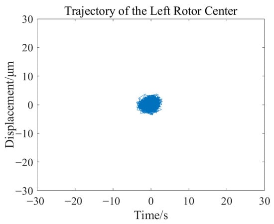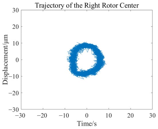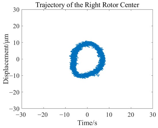 Under the condition of stable rotor suspension, the motor speed was altered, and the displacement changes in the rotor at different speeds were recorded. When the speed stabilized at 500 rpm, the rotor displacement changes are shown in Figure 30 and Figure 31, the trajectory of the left rotor axis is depicted in Figure 32, and the trajectory of the right rotor axis is illustrated in Figure 33.