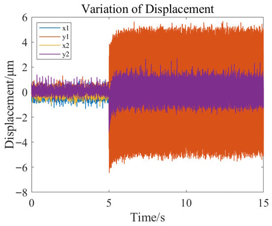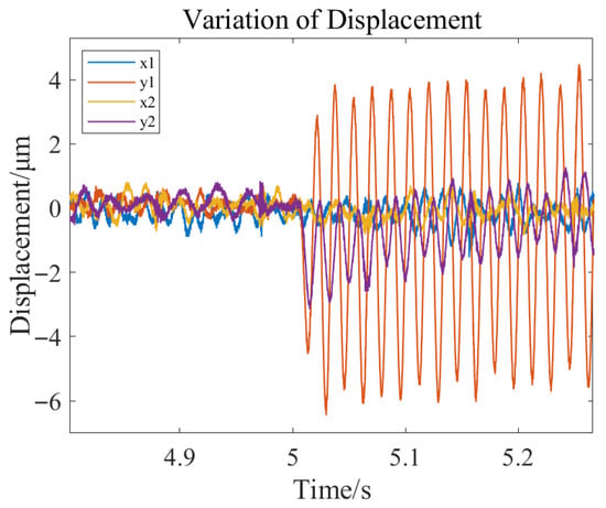 In the state of stable rotor levitation, a sinusoidal external disturbance force is applied to the rotor through the excitation magnetic bearing on the experimental bench (as shown in Figure 25). The excitation magnetic bearing does not make contact with the rotor but acts on the rotor through electromagnetic force. The amplitude of the disturbance force is 0.3 A, with a frequency of 30 Hz, and the direction is vertical. The changes in rotor displacement are shown in Figure 38 and Figure 39.