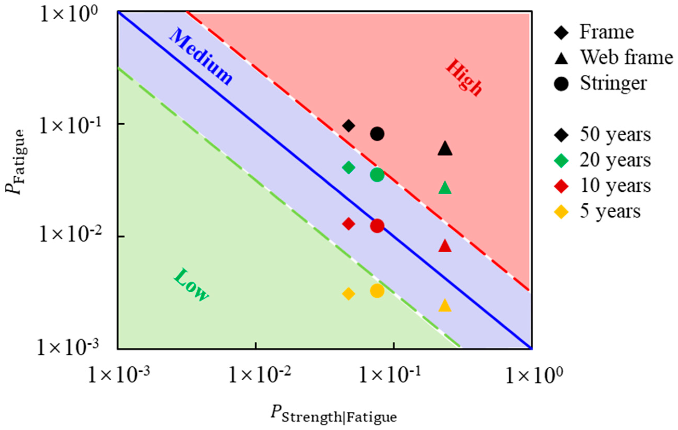 - The probabilistic models adopted for fatigue and ultimate strength evaluations employ simplified statistical distributions, and the effects of uncertainties such as material degradation, crack growth behavior, and repair actions were not explicitly incorporated.