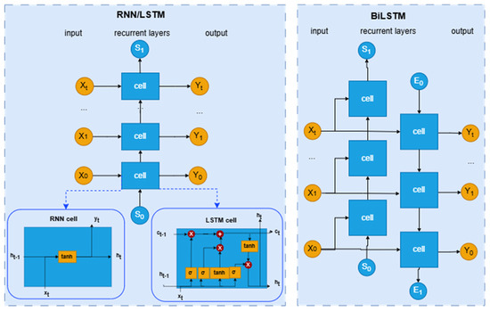 Among them, RNN-based models are inherently designed for time-series data. Recurrent Neural Networks (RNNs) are neural network structures with cyclic connections used for processing sequence data. Unlike traditional feedforward neural networks, RNNs can capture temporal correlations in sequences, but they suffer from issues like gradient vanishing and exploding. Basically, they operate by processing one time step at a time; each hidden state is updated based on the current input and the previous hidden state. This sequential recurrence explicitly encodes the temporal order and dependency, making them naturally suited to time-series data. In our research, we considered three RNN-based deep learning models: the original RNN, LSTM, and BiLSTM. Their structures are depicted in Figure 2. As we can see from it, the cell of the original RNN is relatively simple and accepts only the input of the current time step and the hidden state of the previous time step and updates the hidden state of this time step by a non-linear activation function, such as tanh, to generate the output for the current time step. The simplicity of RNN’s cells makes RNN lack the ability to memorize long-term dependency, leading to possible gradient vanishing and exploding [49].