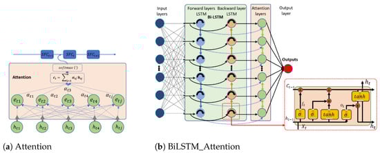 The other series of models we considered in our research, which can also capture dependencies among different data records but implicitly capture the time-series dependency, are attention-based models (see Figure 4a). The attention mechanism captures dependencies among data records in a time-series dataset by computing pairwise interactions between all time steps. Each time step is represented by a feature vector, and the mechanism assigns a weight to every other time step based on the similarity between their representations. These weights determine how much each time step should contribute to the representation of the current step [53]. As we can see from the above-explained attention mechanism, the attention mechanism itself does not pay attention to the order of data records. Therefore, for attention-based models, to mitigate this problem, positional encoding is commonly added to the inputs to retain the order of the data records, as proposed in original self-attention-based model Transformer [53]. In traditional LSTM or BiLSTM, the hidden state at the last time step (or the concatenation of hidden states in two directions) is usually used to represent the entire sequence, which may lead to an information bottleneck because a fixed-dimensional vector may not be able to fully retain all the information in a long sequence. The attention mechanism constructs the context vector by weighted summing the hidden states of all time steps, thereby retaining more information. LSTM itself is already capable of handling long-sequence dependencies through gating mechanisms, but the attention mechanism can further assist the model in focusing on the parts of the sequence that are most relevant to the current output, thereby better capturing the key information in long sequences. BiLSTM captures past and future information through LSTM in both forward and backward directions, and the attention mechanism can weight the hidden states at different time steps based on the information in these two directions, thereby making more flexible use of the context (see Figure 4b).