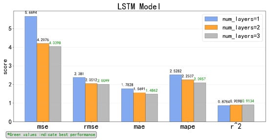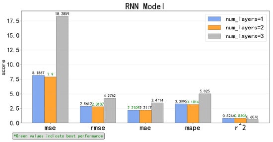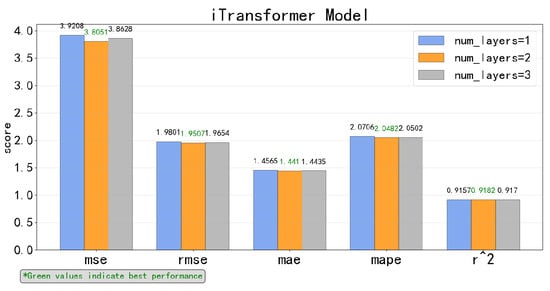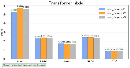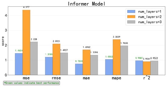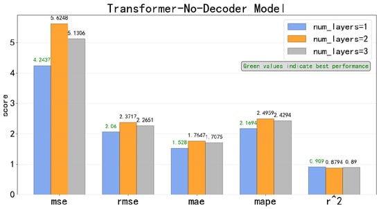 Figure 5 shows all the metrics mentioned above for the RNN-based SFC prediction model by adopting a different number of hidden layers. As we can see from the results, the MSE and score results show a similar ranking trend; i.e., if the result of a test option has a lower MSE compared to other option, then its score will be higher than that of the compared option. The best performance for RNN can be found when there are two hidden layers. Figure 6 shows the MSE and scores for the LSTM-based SFC prediction model by adopting a different number of hidden layers. The results of MSE and scores show a similar ranking trend, the same as the RNN’s results. The best performance for LSTM can be found when there are three hidden layers. Figure 7 shows the results for the BiLSTM-based model, whose MSE and score results also stay consistent. The best performance for BiLSTM occurs when the number of hidden layers is three. Figure 8 shows the results for the LSTM–attention-based model. The best performance for LSTM–attention can be found when there are three hidden layers. Then, Figure 9 shows that BiLSTM–attention and LSTM–attention have similar results. Figure 10 shows the results for the original Transformer-based model, whose MSE and score results also stay consistent. The best performance for the original Transformer is achieved when the number of hidden layers is three. Figure 11 shows the results for the Transformer-No-Decoder model, whose MSE and score results also stay consistent. The Transformer-NoDecoder provides the best prediction performance when the number of hidden layers is one. Figure 12 shows similar results for the iTransformer model, and its best setting is two hidden layers. Figure 13 shows the results for the Informer model, whose MSE and score results also stay consistent. The Informer predicted SFC most accurately with one hidden layer.