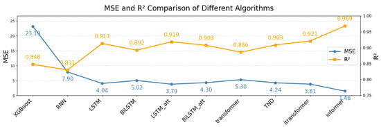 The comparison results of using different prediction algorithms for the mixed model are shown in Figure 14. As we can see from it, the two result lines of MSE and scores demonstrate an opposite state, which indicates the same trend in the performance of different algorithms, as lower MSE and higher scores refer to better performance. Among the RNN-based models, LSTM–attention achieved the best performance in SFC prediction, with 3.79 and 0.919 for MSE and scores, respectively. The inferior performance of BiLSTM compared to LSTM indicates that the fuel consumption data of ships is not impacted by future information on current fuel consumption. Therefore, LSTM, which only considers historical data, performs better. However, BiLSTM still outperforms RNN, which also indicates that relatively complex dependencies exist in the energy efficiency data. Among them, the MSE obtained by the worst-performing RNN is also much lower than that of XGBoost, which indicates the temporal dependence of energy efficiency data recording and the importance of sequence. As can be seen from the chart, LSTM–attention has a slight edge over LSTM, which indicates that the attention mechanism helps optimize the results obtained by LSTM. However, the performance of Transformer and Transformer–No–Decoder did not surpass that of LSTM. There are already related studies questioning the effectiveness of Transformer in the time-series prediction field [61]. The reason behind this may be that Transformer-based models introduce time correlation through position encoding, which is significantly weaker in time-series modeling capability compared to other models. Then, the iTransformer, which is more suitable for time-series prediction, indeed meets expectations. Its performance is better than that of the LSTM–attention model, and it also proves that in the task of predicting ship fuel consumption, it is more crucial to deeply explore the intrinsic correlations between multivariate features than simply optimizing sequence modeling in the time dimension. The Informer model is a relatively new one and has achieved good results in multi-step prediction in the energy field. In this experiment, Informer was also the best-performing model, with 1.46 and 0.969 for MSE and scores. Compared with Transformer, Informer proposes PorbSpare self-attention, reducing the computational complexity to handle longer time series. It explicitly models using the distillation mechanism to capture multi-scale dependencies; a generative decoder is proposed to obtain the output of long sequences to avoid the continuous accumulation of errors. In summary, Informer is the most suitable algorithm for the time-series prediction module in the hybrid model proposed for TL in this study.