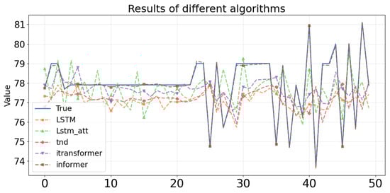 In order to compare the algorithms more deeply and figure out the specific prediction result, we visualize parts of the prediction values in this section for all algorithms. We have selected 50 consecutive predicted values, and in order to represent them more clearly, we only choose the top 5 models in terms of predicted performance: LSTM, LSTM–attention, Transformer–No–Decoder, iTransformer, and Informer. They are shown in Figure 15. From the overall trend, the Informer model’s prediction curve has the highest degree of fit with the true value, almost achieving synchronous fluctuations, indicating excellent prediction accuracy and timeliness. In contrast, although the prediction curves of other models can capture the general trend of the true values, there is a significant lag phenomenon, with peaks and valleys always appearing several time steps later than the true values. In addition to the Informer model, we can see that the predicted values of the LSTM–attention mixed model are closer to the true values. Although the overall curve fluctuation of LSTM is closer to the real curve, there is a certain gap between the basic and real values. The accuracy of its results cannot be compared to Informer and LSTM–attention. It is sufficient to prove that the attention mechanism can optimize LSTM models. Therefore, the Informer model performs the best in predicting ship fuel consumption, as it can most effectively capture long-term dependencies in time series, avoiding the prediction lag problem that other models may encounter, thus achieving the closest prediction results to reality.