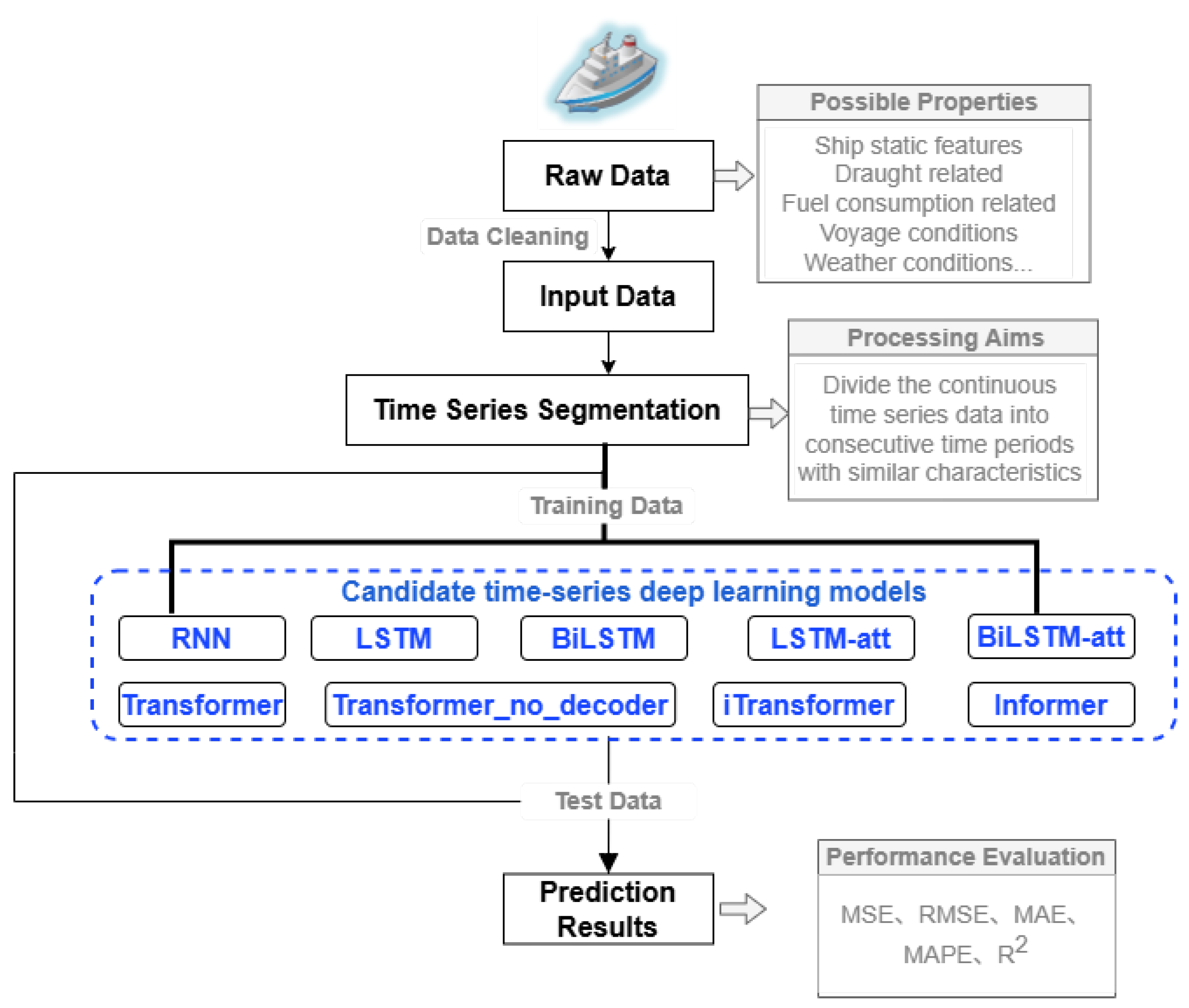 - We implemented in total nine time-series deep learning models for the SFC prediction task, including three RNN-based time series models, four attention-based models, and two RNN–attention mixed models. Among them, we applied models such as Transformer, iTransformer, and Informer to the prediction of ship fuel consumption for the first time and discovered their significance in improving the prediction accuracy.