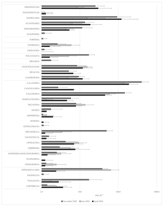 Mean abundances of the identified taxa, other than Calanoida, at the three sampling times (each time deriving from three sites and a total of 9 replicates), expressed as ind.·m−3. Abundances are presented on a logarithmic scale (base 10). Error bars represent the standard deviation between all replicates.
