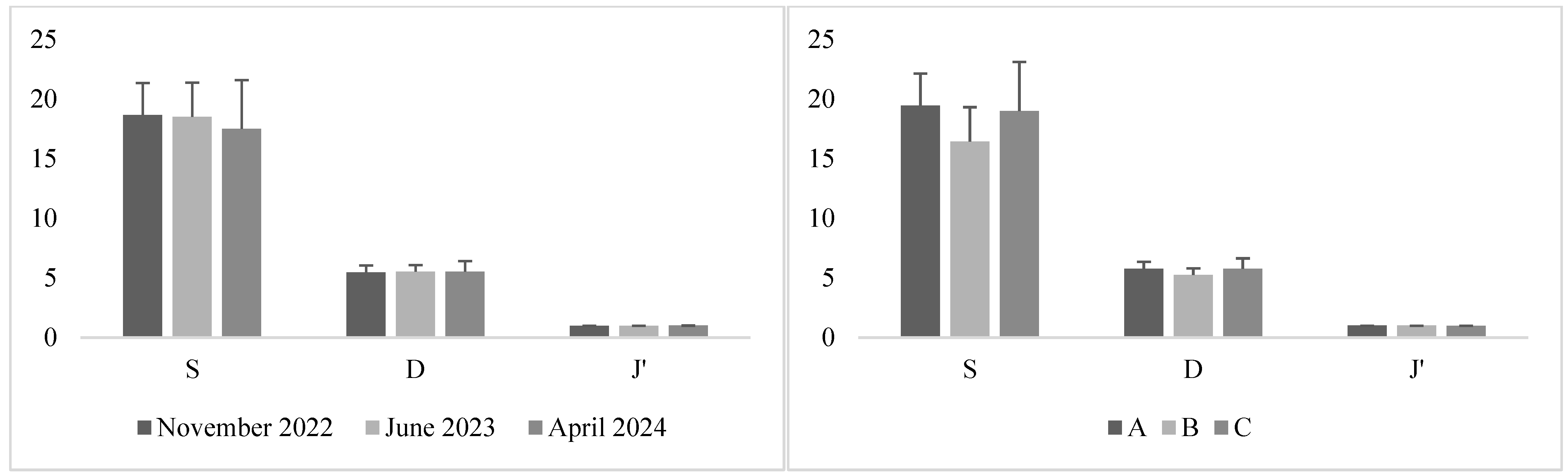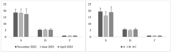 Diversity index values (species richness, S; Margalef’s index; D; and Pielou’s evenness, J′) across sampling times (November 2022, June 2023, and April 2024; (left)) and stations (A, B, and C; (right)). Error bars represent standard deviations.