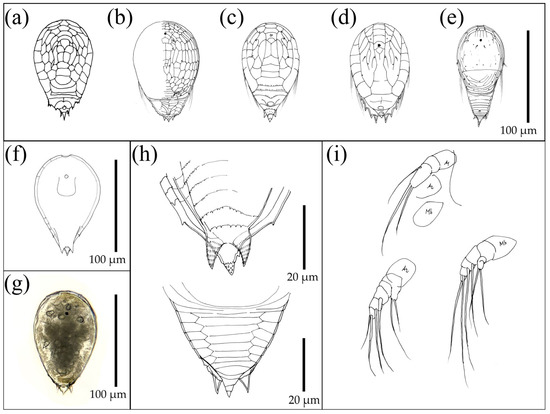 Nauplius of Facetotecta found in Tyre zooplankton and reference existing species, included for visual comparison with the sampled organisms. (a) Proteolepas sp. (from [56]). (b) Hansenocaris leucadea Belmonte, 2005 (from [54]). (c) H. salentina Belmonte, 2005 (from [54]). (d) H. corvinae Belmonte, 2005 (from [54]). (e) H. mediterranea Belmonte, 2005 (from [54]). (f) Drawing of the Facetotecta found in Lebanon. (g) Microscope photography of the Facetotecta found in Lebanon. (h) Drawing details of ventral (up) and dorsal (down) terminal spines of Facetotecta found in Lebanon. (i) Drawing details of appendices A1, A2, and Mb (antennulae, antennae, and mandibles, respectively) of Facetotecta found in Lebanon.