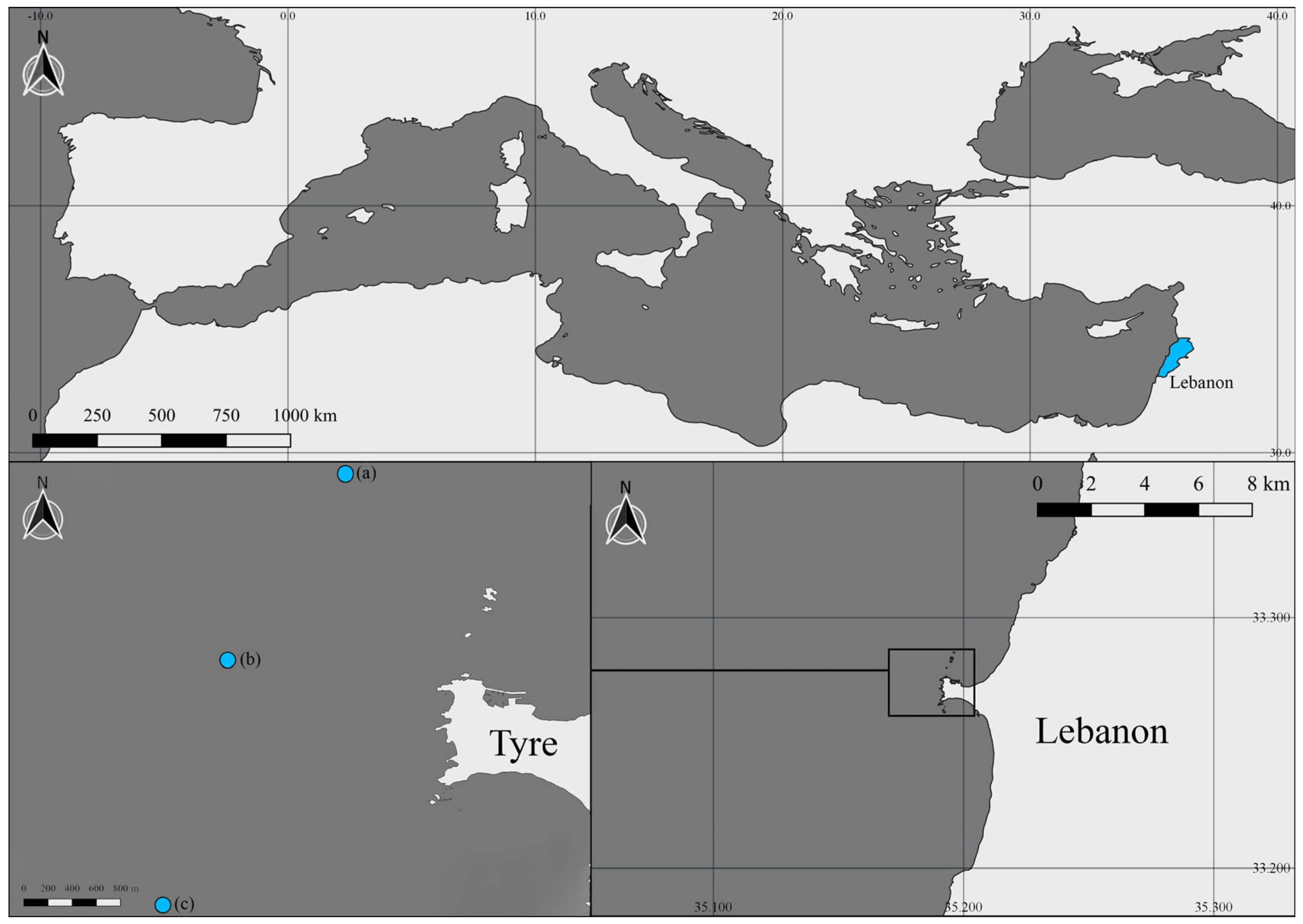 Sample collection was carried out in November 2022, June 2023, and April 2024, within the framework of the Blue Tyre project, at three stations (a, b, c) off the coast of Tyre (south Lebanon) (Figure 1).