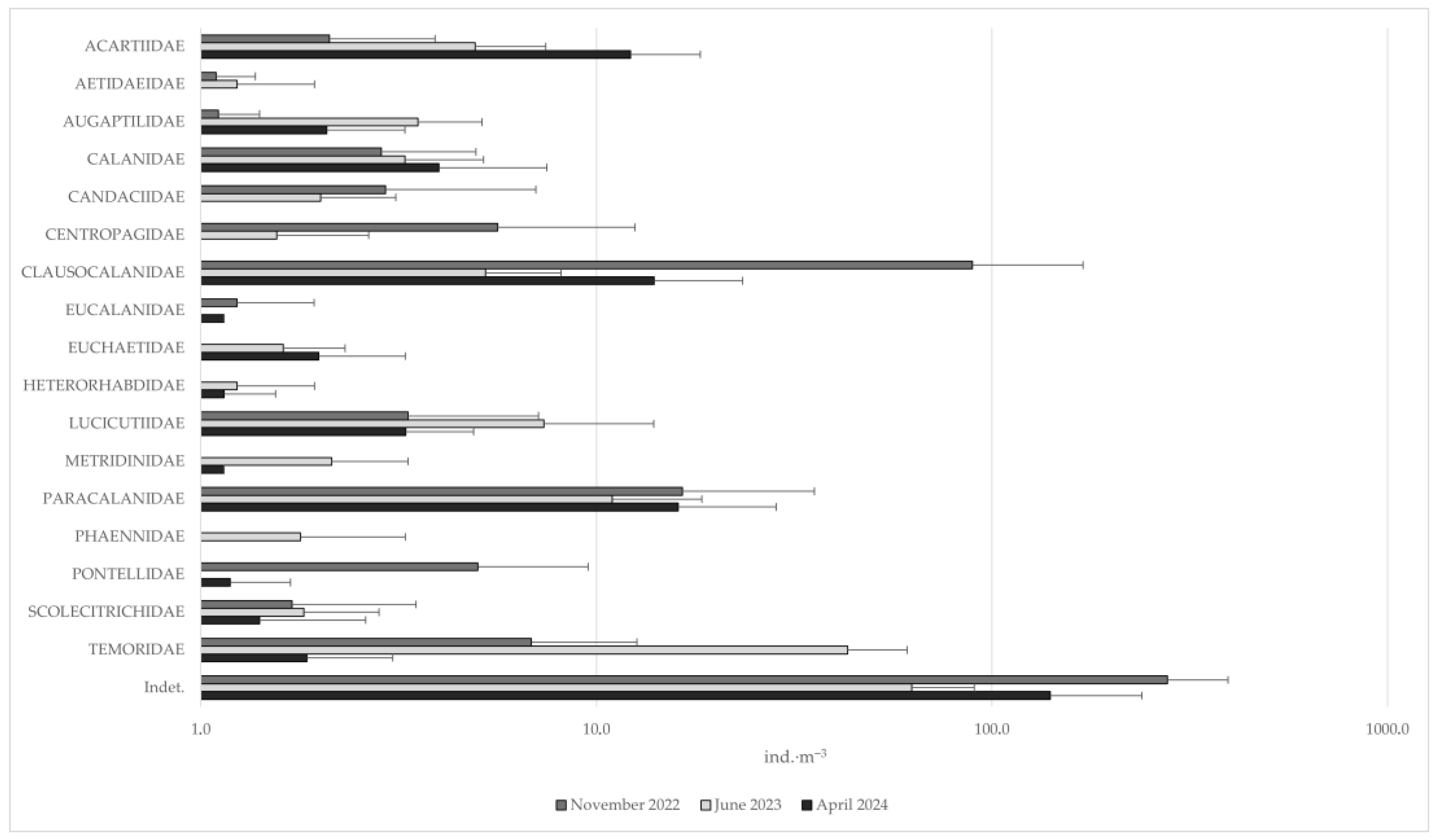 Mean abundances of the identified Calanoida families at the three sampling times (each time deriving from three sites and a total of 9 replicates), expressed as ind.·m−3. Abundances are represented on a logarithmic scale (base 10). Error bars represent the standard deviation between all replicates.