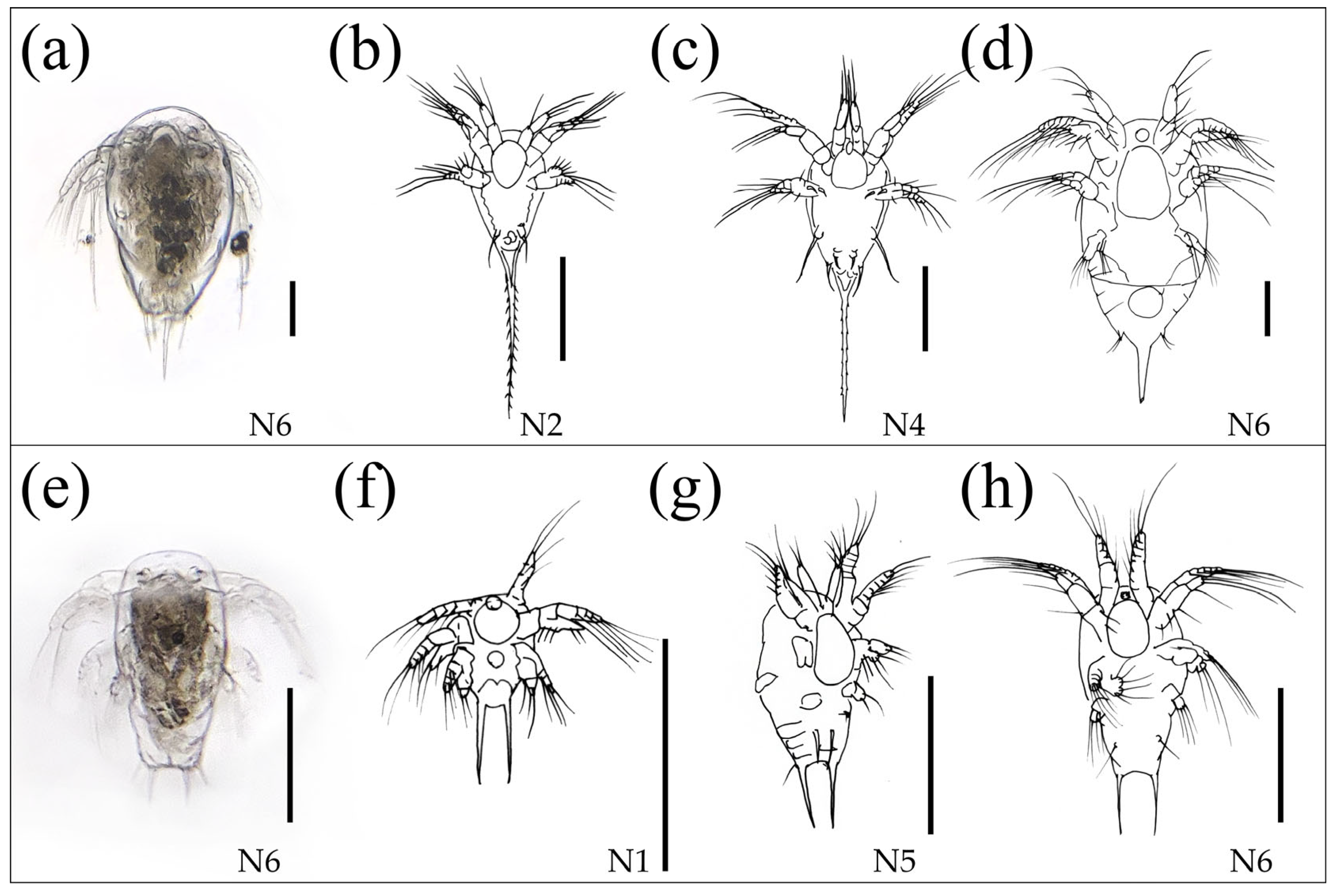 (a) Microscope photography of one of the Longipedia nauplii found in Lebanon. (b–d) Drawings of various stages of Longipedia nauplii found in Lebanon. (e) Microscope photography of one of the Canuella nauplii found in Lebanon. (f–h) Drawings of various stages of Canuella nauplii found in Lebanon. All the scale bars measure 100 μm.