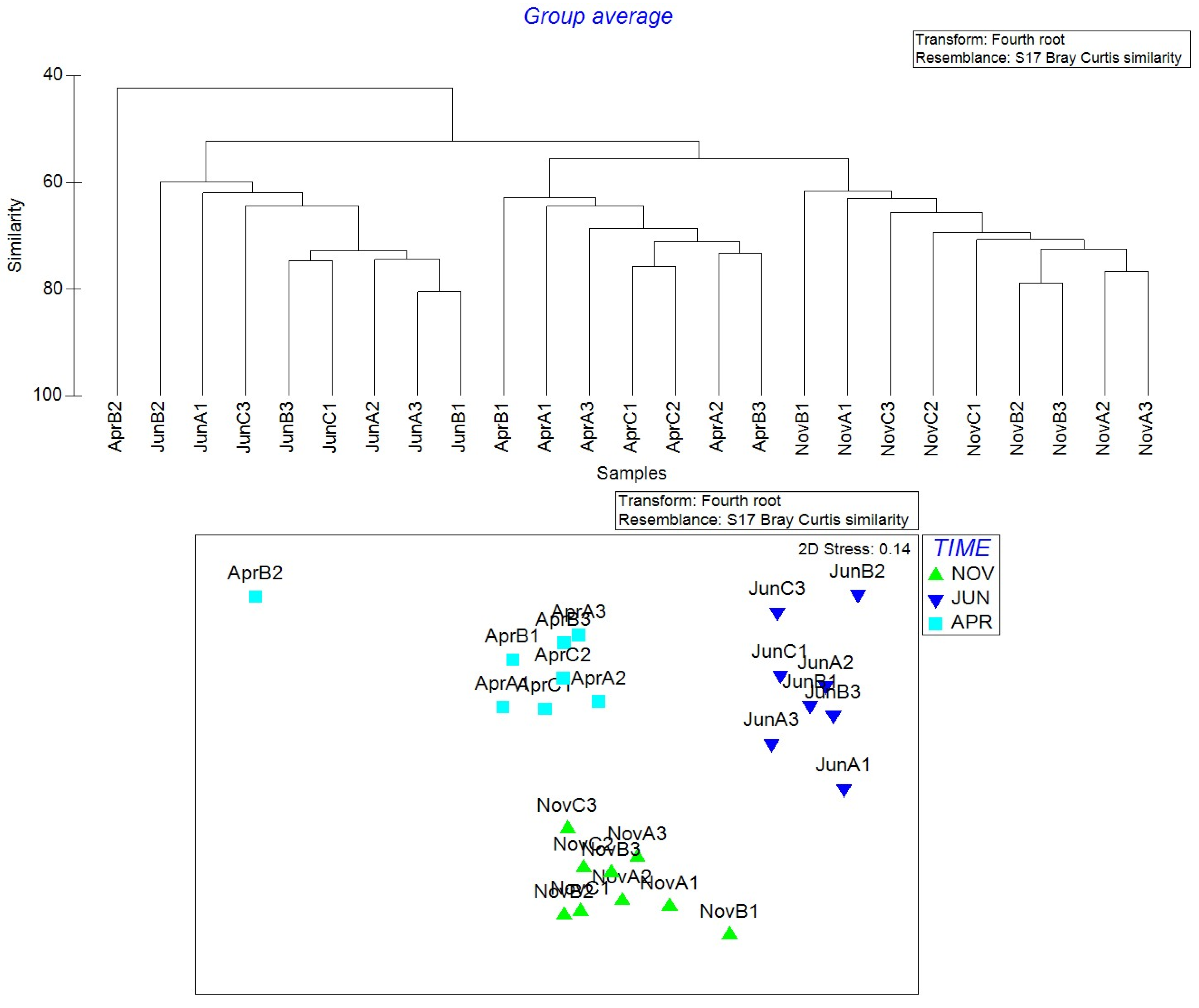 (Up), the cluster graph of samples. All the samples, except AprilB2, of the same time (November 2022, June 2023, April 2024) cluster together at the minimum similarity level of 60%. (Below), the MDS plot representation.