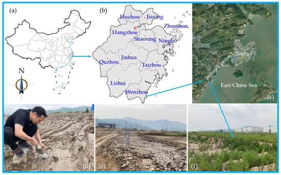 Location and overview of the project. (a) Schematic map of China. (b) Schematic map of Zhejiang Province. (c) Location of the project. (d) On-site sampling. (e) Dredged sludge being air-dried. (f) Dredged sludge stockpiled at the construction site.