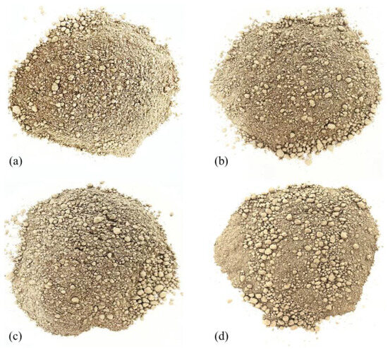 The mucky soil used in the experiment was taken from the Seawall Project in Cangnan County of Wenzhou City, China. The undisturbed mucky soil is grayish-black. After drying, it is noted that the water content of the mucky soil is generally high, among which the water content of the surface mucky soil exceeds 55%. Six groups of representative soil samples are taken on site, and their water contents have little difference. The main physical and mechanical property parameters are shown in Table 1. The coarse-grained soil is affected by rainfall, and the moisture content of two groups of abandoned soil at the construction site is measured to be over 22%. The particle size distribution of the modified soil with single coarse particles (as shown in Figure 2) was determined using a Malvern laser particle size analyzer (Malvern Instruments Ltd., Malvern, UK) [28]. In the particle curve analysis, the powder particles accounted for 84.74% and the clay particles accounted for 77.38%. The particle size distribution curves are shown in Figure 3. The curing agent used is P·O 42.5 Portland cement, and its basic parameters are shown in Table 2. The liquid limit, plastic limit and plasticity index of mucky soil are determined using the STGD-3 photoelectric cone liquid plastic limit combined measuring instrument according to the Chinese standard “Soil Test Method Standard” (GBT 50123-2019) [29]. The experimental plan for multiply modified coastal mucky soil with cement and coarse particle spoil is shown in Table 3.