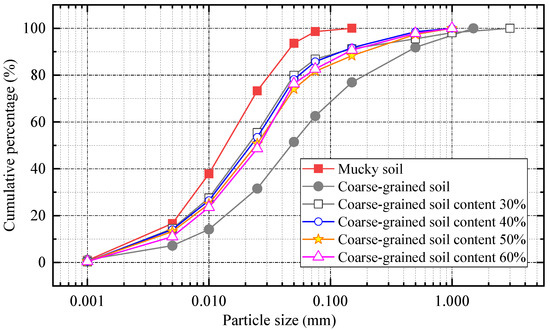 Particle size curves of undisturbed mucky soil, coarse-grained soil and their mixtures.
