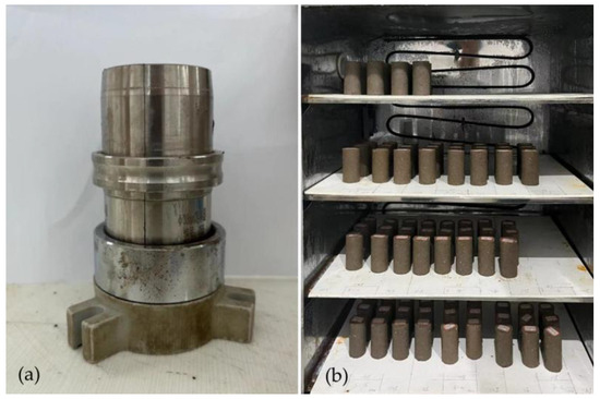 The uniaxial unconfined compressive strength refers to the maximum compressive stress that a soil can withstand without lateral constraints. After drying the mucky soil in the laboratory, it is crushed using a soil grinder and sieved through a 2 mm aperture sieve. The coarse grained soil is dried and sieved through a 5 mm aperture sieve. The sieved soil is stored in a sealed bag. According to Table 3, the soil sample is prepared as a cylindrical specimen with a dry density of 1.46 g/cm3, a moisture content of 30%, a diameter of 38 mm and a height of 76 mm. The prepared specimens are placed in an environmental chamber and kept at a safe distance. The curing temperature is set at 20 ± 2 °C and the relative humidity is above 95%. Unconfined compressive strength tests shall be conducted after the curing period reaches 7 d and 28 d. The sample mold and curing box are shown in Figure 4.