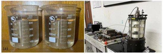 The determination of water stability usually includes two methods: immersion test and spray test. This experiment adopts the immersion test method. After curing the specimens for 6 d and 27 d, they are immersed in distilled water at a constant temperature of 22 °C for 24 h. To ensure that the water head height from the top surface of the specimen to the horizontal plane is consistent during immersion, the specimens are placed in a beaker, and 500 mL of water is added each time to maintain the same water level. The unconfined compressive strength test is conducted using a GDS triaxial apparatus. During the test, a cylindrical specimen with both ends flattened and kept perpendicular to the long axis is placed on the base of the triaxial apparatus. According to the Chinese Regulation “Geotechnical Test Regulations” (SL 237-1999) [30], the test loading rate is controlled by a strain-controlled method. The maximum target value of axial strain is set at 8%, and the compression speed is 1 mm/min. Figure 5 shows the immersion and unconfined compressive strength test of the specimen. The water-stability coefficient is generally denoted by [31], and its calculation formula is as follows: