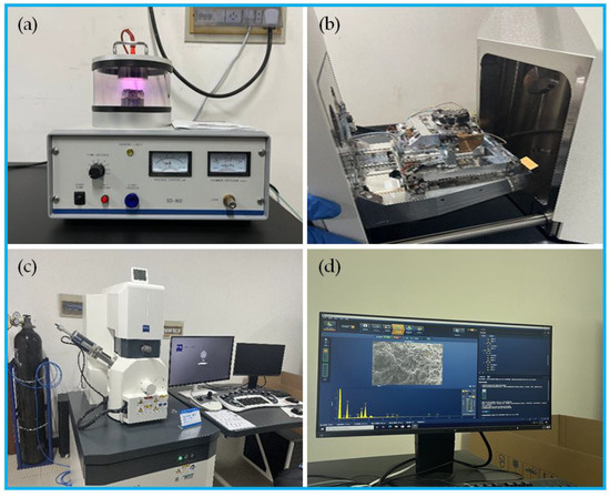 Microscopic experimental testing process. (a) Gold sputter coating of the sample. (b) Soil sample loading. (c) SEM (Scanning Electron Microscopy) scanning test. (d) EDS spectral analysis.