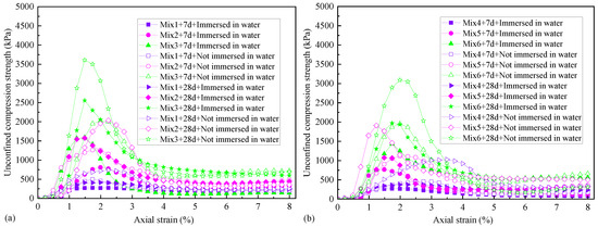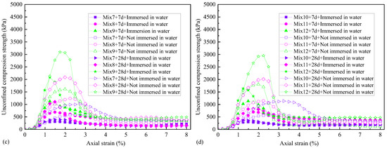 The stress–strain relationship curves obtained from UCS tests of multiply modified soil cured for 7 d and 28 d with and without immersion are shown in Figure 7. The data behind the first “+” sign represent the curing age, and the text behind the second “+” sign represents whether the soil sample is immersed in water.