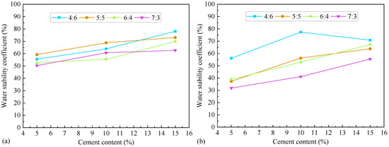 The relationship between the water-stability coefficients of the sample and cement contents with different curing ages. (a) 7 d curing age; (b) 28 d curing age.