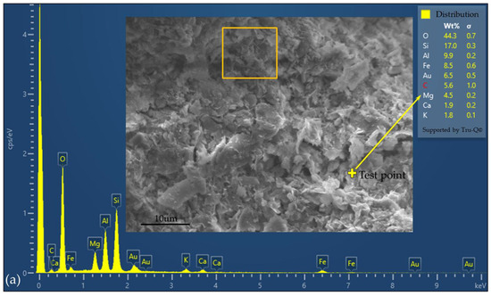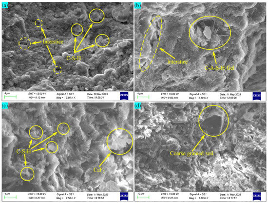 As shown in Figure 9a, it can be seen that the microstructure of the modified soil with a 7 d curing age is not dense, with a relatively loose flocculent structure on the surface, accompanied by many pores with sizes of 1–3 μm (as shown by the red dashed line in the figure). There are not many sheet-like cementitious materials produced in the early stage, and the volume of the cementitious material is also small. The image shows more small particle like mucky soil, which is consistent with the conclusion that the unconfined compressive strength of the modified soil solidified in the early stage is low. As depicted in Figure 9b, the pore volume of the modified soil after a 28 d curing age is further reduced, the microstructure is denser, and the cross-section is smoother. The red dashed line in the picture shows long cracks, which are mainly caused by defects during the sample preparation process. With the increasing curing age, the cement hydration process generates more large-size hydrated calcium silicate gel (C-S-H gel) and hydrated calcium sulphoaluminate gel (C-A-S-H gel) [33,34]. The cementitious structure is shown as slender fibers and strips in the electron microscope image, presenting an interlaced and connected network, and filling the gap between mucky soil and coarse particles. The hardness and strength of modified soil are enhanced through crystallization and cementation. Similar findings are also found in the test of the literature [35]. It can be seen from Figure 9c that the internal microstructure of modified soil with a 56 d curing age becomes more compact as time goes on, which is mainly because the cement has enough time to carry out hydration reaction and the hydration reaction is more thorough, resulting in more C-S-H gel, C-A-S-H gel and hydrated tetracalcium ferroaluminate (C4AF). In Figure 9, there are many flat and flaky crystals with different sizes of clustered cementitious products, all of which are products of cement hydration. Among them, calcium hydroxide crystals have a smooth surface and clear grain boundaries, making them easier to identify. Due to the influence of hydration conditions and cement composition on the morphology of crystals, other small amounts of sulfate type compounds (such as calcium gypsum and calcium magnesium gypsum) may also exist in similar sheet-like crystal forms. The size of the sample observed at 2500 times is small and the range is limited, and no obvious coarse-grained soil morphology was observed in the test results. Therefore, by reducing the image to 1000 times, a larger range of microscopic morphology can be seen. As shown in Figure 9d, the coarse-grained soil has a prism-shaped cubic structure, with a size several times that of the mucky soil particles. The experimental results clearly show that the cementitious products are tightly filled in the gaps between coarse-grained soil and mucky soil particles, forming a strong network structure, making the multiply modified soil have higher strength and stability [36].
