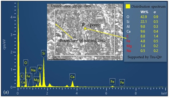 To investigate the spatial uniformity of hydration products within the stabilized soil, energy-dispersive X-ray spectroscopy (EDX) was employed to map elemental distributions across the analyzed area of a specimen cured for 28 d, as shown in Figure 10.