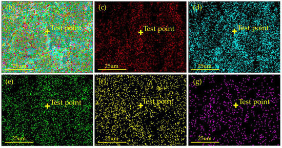 EDX analysis results of samples with a 28 d curing age. (a) Total element distribution of the test points. (b) Elemental distribution map of the major constituents within the test area. (c) Oxygen (O) distribution. (d) Silicon (Si) distribution. (e) Aluminum (Al) distribution. (f) Calcium (Ca) distribution. (g) Magnesium (Mg) distribution.