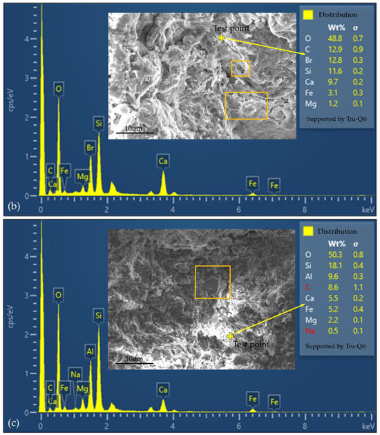 EDX analysis results of samples under 7 d, 28 d and 56 d curing ages. (a) Test results with a 7 d curing age. (b) Test results with a 28 d curing age. (c) Test results with a 56 d curing age.
