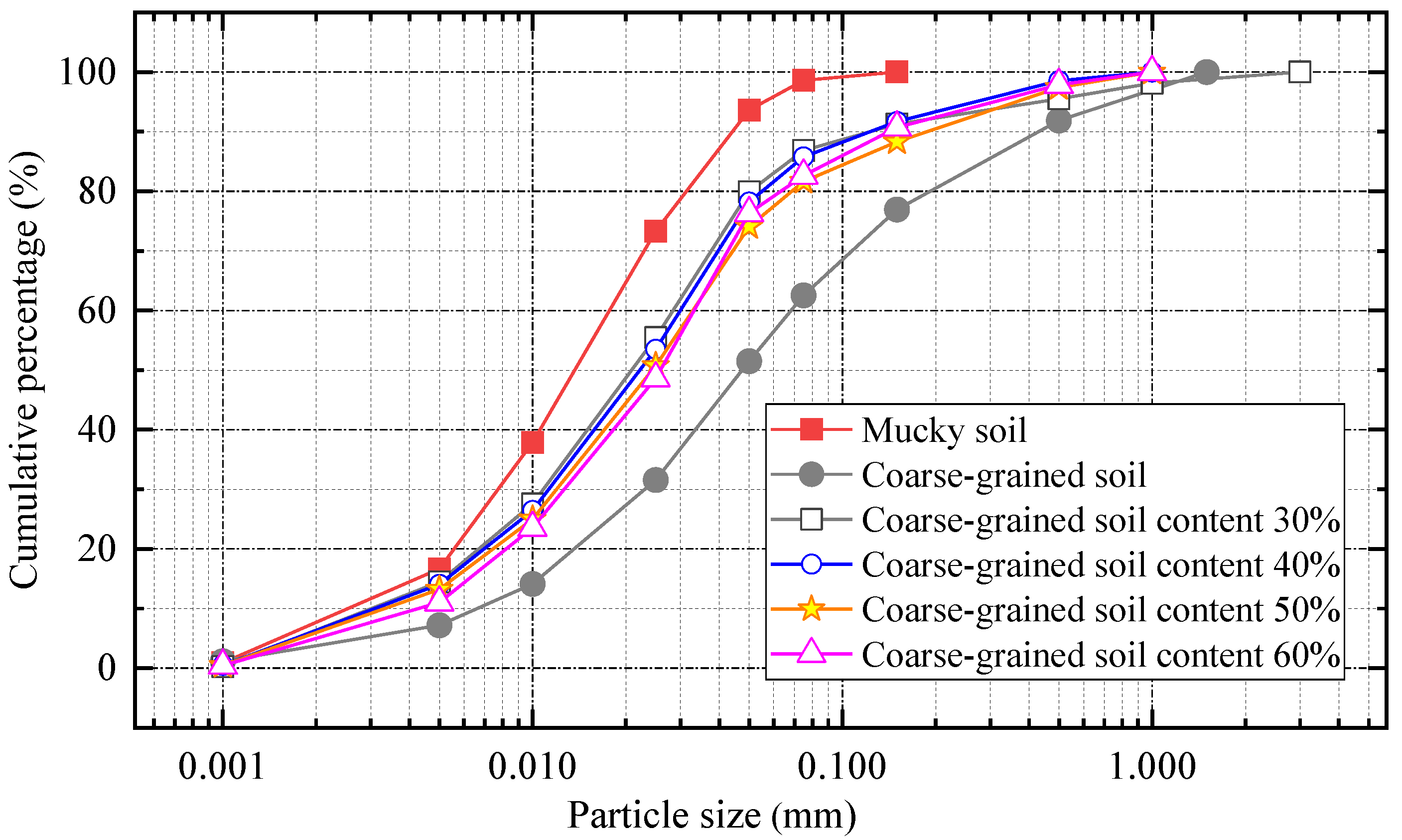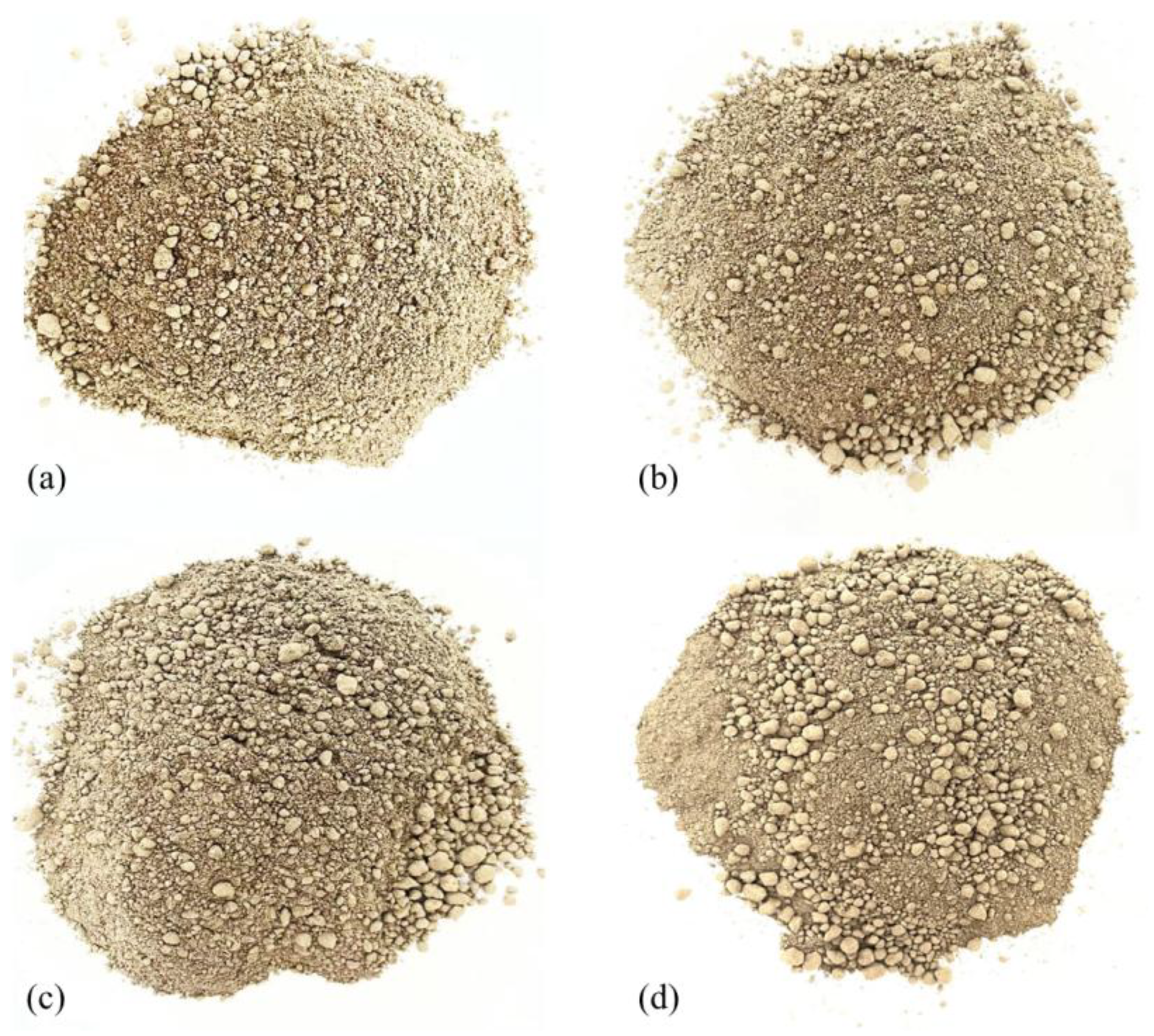 - Qin, Y.Y.; Qin, Z.P.; Huang, H.; Jiang, G.R.; Guo, X.D.; Huang, Y.X.; Zheng, Y.N.; Xu, E.J.; Gao, J.Q. Experimental Study on Composite Solidification and Improvement of Silt Soil by Cement and Coarse Particle Engineering Spoil. Sci. Technol. Eng. 2024, 24, 5076–5087. (In Chinese) [Google Scholar]