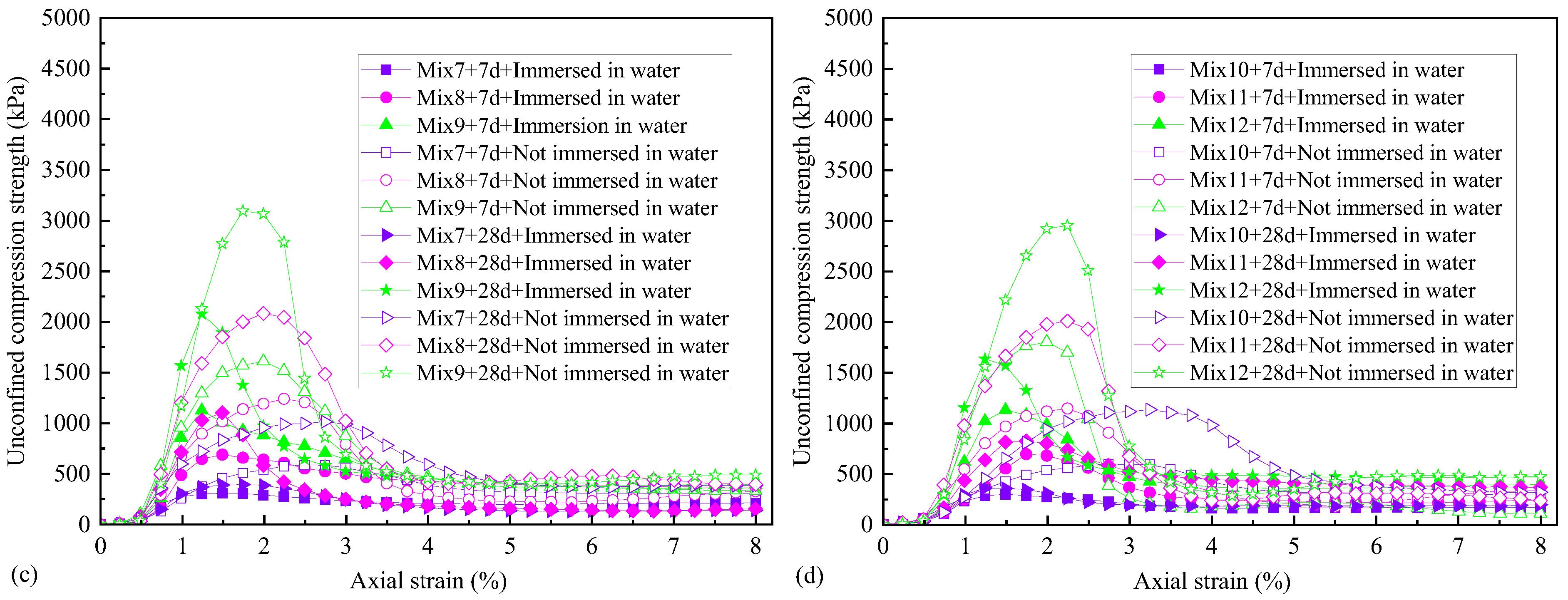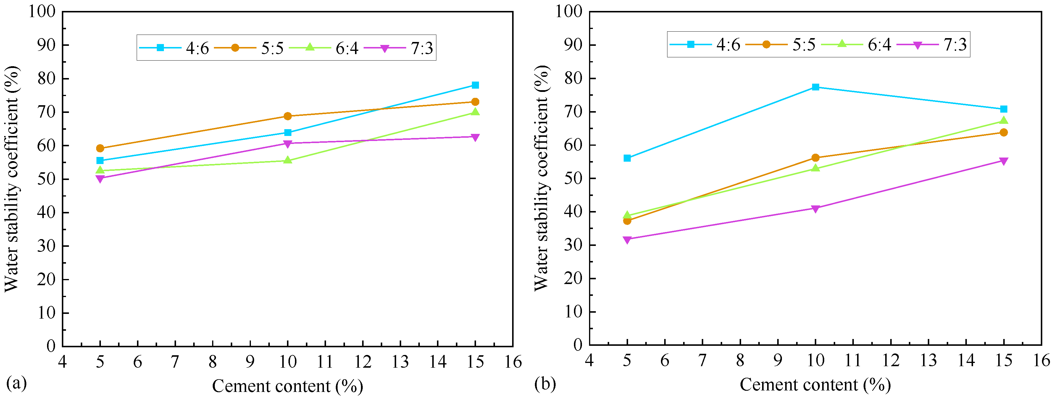 - The UCS of the cement-modified soil after immersion is consistently lower than its pre-immersion value at both 7 d and 28 d. At 7 d, the blend containing 60% coarse-grained soil exhibits the highest water-stability coefficient under all three cement levels, peaking at 0.862 for the 4:6 aggregate/cement ratio with 5% cement. After 28 d of curing, the same 60% coarse-grained fraction again produces the greatest water-stability coefficient among the four granular contents, corroborating the 7 d trend and reaching a maximum of 0.774 at the 4:6 ratio with 10% cement. To enhance the stability of soil properties, a mix proportion of 60% coarse-grained soil combined with 15% cement is recommended; conversely, for scenarios in which cost-effectiveness is the primary concern, a blend comprising 60% or 50% coarse-grained soil and 10% cement may be adopted.