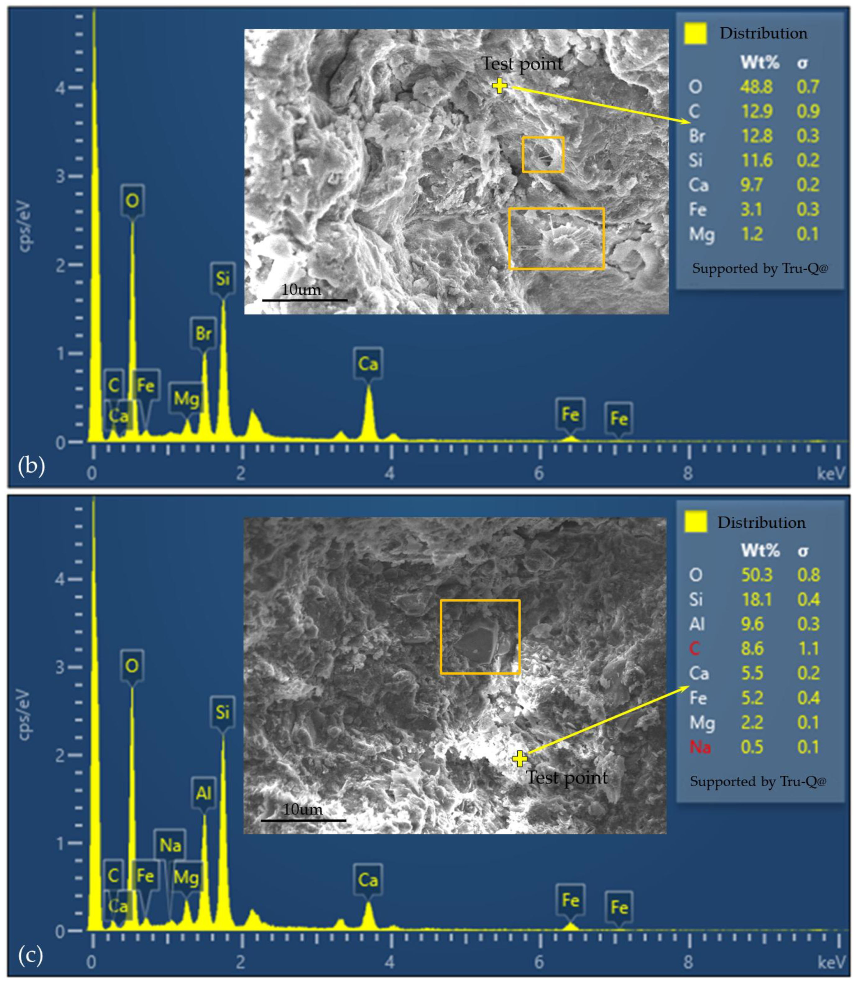 - Microstructural and compositional analyses demonstrate that inter-particle voids progressively diminish and crack apertures narrow as the curing period is extended. Coarse grains function as a rigid skeleton, while the ongoing cement-hydration reaction densifies the matrix. Hydration products, predominantly colloidal oxides, form extensive bonding networks, markedly enhancing both strength and water stability. Consequently, the synergistic modification of coastal mucky soil with cement and coarse-grained waste not only upgrades its physico-mechanical performance but also provides a high-volume outlet for engineering spoil. These findings furnish a robust theoretical framework for the stabilization of soft coastal deposits and the sustainable management of coarse-grained construction by-products.