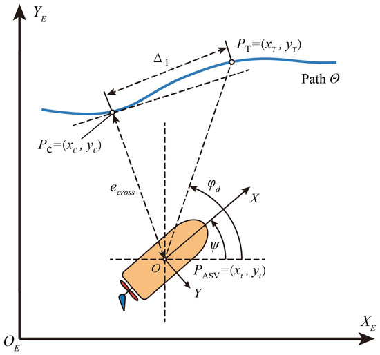 For motion control, it is necessary to first define the state of the ship in the reference coordinate systems. Here, we use the Earth coordinate system and the body-fixed coordinate system to describe the ship’s motion parameters. As shown in Figure 1a, the Earth coordinate system is established on a tangent plane to the Earth surface, with the x-axis towards the north, the y-axis towards the eas, t and the z-axis perpendicular to the Earth’s surface. In the body-fixed coordinate system, the ASV is treated as a rigid body, with the x-axis towards the bow, the y-axis towards starboard, and the z-axis towards the bottom of the ship. This paper considers a three-DOF mathematical model of ASV operating on the water surface, and the corresponding horizontal reference coordinate systems are illustrated in Figure 1b.