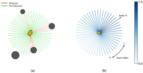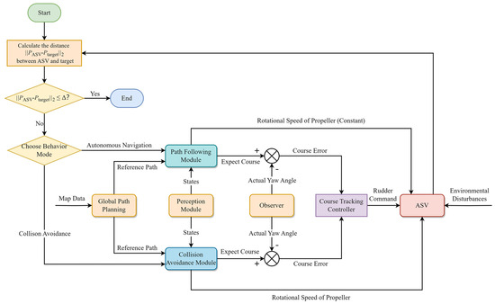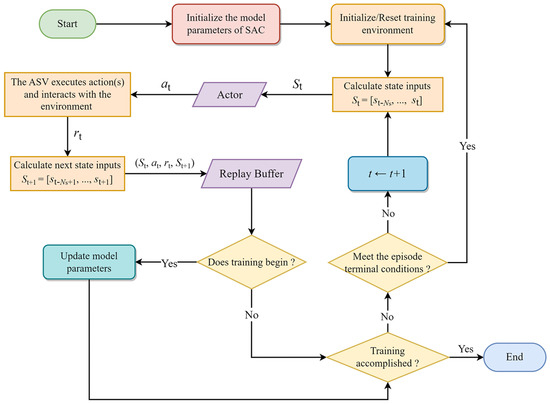 In recent years, artificial intelligence technology, especially reinforcement learning (RL), has garnered widespread attention for its potential in handling complex decision-making and control challenges. The goal of RL is to learn an optimal policy by facilitating interactions between the agent and the environment. It demonstrates application prospects in fields like autonomous driving and drone flight [4,5]. Although RL has made considerable progress in various domains, its utilization in the navigation of ASVs still remains at an early stage. Marine vehicles are required to analyze various environmental data in real time and adapt to ever-changing obstacles and complex sea conditions. Traditional rule-based methods [6,7,8] have the weakness of poor scalability and tend to be inflexible when dealing with dynamic marine settings. Additionally, model-based control and decision-making approaches [9,10,11] often depend on a precise ship mathematical model. In comparison, RL or deep reinforcement learning (DRL) algorithms transform inputs from multiple channels into executable outputs within a black-box framework. An RL-based algorithm eliminates the necessity for manually established rules and exact specifications. Moreover, it is capable of handling features that are not easy to directly quantify, such as images, natural language, etc. [12]. Ref. [13] achieved ship path following through a line-of-sight guidance algorithm and subsequently trained a collision avoidance policy utilizing the proximal policy optimization algorithm. This approach was verified under unknown environmental disturbances. However, the state space incorporated global coordinate information, and the policy need to be retrained in new scenarios. Ref. [14] developed a dual-layer navigation system comprising a long-term planner and a short-term decision maker using a deep Q-network (DQN) algorithm. The planner first generates a global path. Then, the decision maker utilizes environmental images as input to a convolutional neural network. Nonetheless, this method did not consider the ship’s dynamics. Ref. [15] implemented a dueling deep Q-network for the autonomous navigation and obstacle avoidance of unmanned surface vehicles (USVs). The convergence speed of this algorithm outperformed DQN and Deep SARSA in both static and dynamic environments, although the control variables in this method were the surge force and yaw moment, instead of the direct control of actuators and rudders. Additionally, the wind velocity and direction were not included in the simulation platform. Ref. [16] presented an autonomous navigation system for USVs that sensed ocean conditions in real time and output rudder angle control commands. They employed a double Q-network to facilitate end-to-end control, but the feasible rudder angles were discrete. Ref. [17] introduced an improved deep deterministic policy gradient method. LiDAR was integrated to provide inputs for collision avoidance perception, enabling autonomous navigation and collision avoidance by controlling the rudder angle without relying on global information. However, in this method, environmental disturbances were not considered. Ref. [18] proposed a maritime autonomous surface ship autonomous navigation system using dueling deep Q-networks with prioritized replay. Along with the wind, current, and wave data, the system also utilized the data from the ship’s automatic identification system (AIS) to construct the navigation environment. However, the state space was dependent on the geographic locations of both the ship and the target. It also employed a discrete action space and ignored the throttle operation of the vessel. Ref. [19] controlled the ship’s acceleration and rudder angle in straight-line water channels and compared the performance of various DRL algorithms. However, this study assumed a very simplistic navigation environment, limiting its applicability to real-world scenarios.