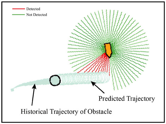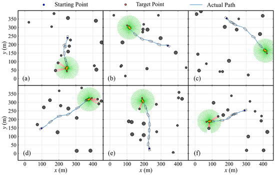 Simulation experiments, focused on the collision avoidance policy in environments characterized by random static and multiple dynamic obstacles, are conducted in this section. First, Figure 24 shows six simulation trajectory results of static obstacle avoidance experiments in calm water. The size of the simulation map is 640 m × 360 m, and the initial yaw angle of the ASV, radius range of the obstacle, detection radius of the LiDAR, and the number of laser beams are the same as those in Section 5.2.2. It is evident that, at various coordinate positions, the vessel effectively detects static obstacles and successfully achieves autonomous collision avoidance.