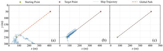 The policy is trained for a total of 2,000,000 iterative steps, with each 1000 steps counted as one epoch. Model parameters of the actor are saved after each epoch, and the model is then verified over 10 episodes to assess the success rate and average reward per step of the agent. The initial yaw angle of the ASV is randomized before the start of episode, and the PWM is 80. To illustrate the training process of the policy, Figure 9 shows the ship trajectory with examples of three different training stages in which the starting point and the target point are fixed. In Figure 9a, the ASV possesses an entire stochastic policy, and there is no trajectory that arrives at the target point. With the increase in the training epoch, the ASV gradually learns how to complete the path-following task shown in Figure 9b, and all of the trajectories reach the destination shown in Figure 9c. Figure 10a displays the ratio of the successful arrival episodes to the target point out of the total episodes in the first 200 epochs. The “success” here indicates that the ASV can arrive at the target point. Figure 10b illustrates the the average reward and standard deviation for each step throughout the entire validation process. Notably, in the first 50 epochs, the success rate experiences considerable fluctuations, showing the inherent performance of the DRL-based path-following policy, while the average reward per step keeps increasing. In the subsequent epochs, the success rate levels off at 1. Additionally, the variance of the average reward decreases continuously, with the mean value eventually stabilizing around 0.7.