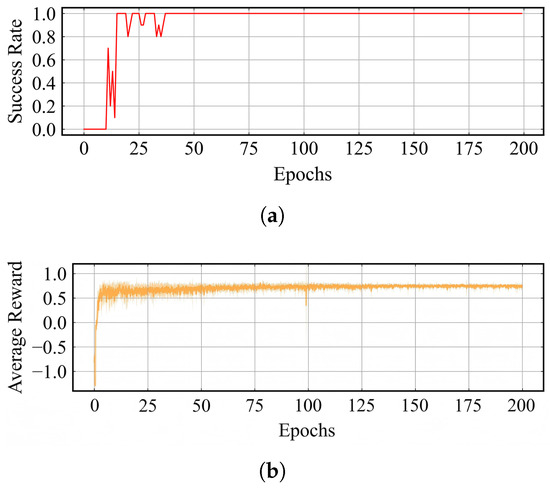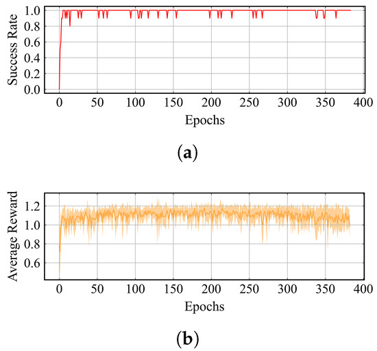 Similar to Figure 9, ship trajectories from three different training stage are shown in Figure 11. The obstacles, the starting point, and the target point remain unchanged. It is obvious that although most of the trajectories in Figure 11 successfully arrive at the target point, the trajectories in Figure 11c are more compact than those from earlier epochs. Figure 12a shows the success rate of the ASV, and Figure 12b presents the average reward and standard deviation for each step. The success rate quickly rises to 1.0 within a few epochs and stabilizes between 0.9 and 1.0 during training. The average reward per step also stabilizes rapidly between 1.0 and 1.2, albeit with distinct fluctuations in the standard deviation.