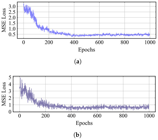 Here, we utilize a publicly accessible ship AIS dataset provided by the Danish Maritime Authority as for the training of the KF-LSTM predictor model [33]. Figure 13 visualizes the AIS dataset, which includes a total of 11,888 navigation trajectories, with each trajectory containing the ship’s Maritime Mobile Service Identity (MMSI) code, time steps, longitudes, latitudes, headings, and velocities. The sampling batch size is 128, with a total of 1000 epochs trained. The model structure contains one LSTM hidden layer with a hidden size of 60. Figure 14 separately shows the change in the MSE error during the training and validation process, indicating a generally decreasing trend from epochs 0 to 200. As the number of epochs increases further, the average training loss ultimately converges to approximately 0.5 and shows less fluctuation than the average validation loss, which stabilizes between 0 and 1.