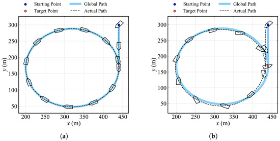 Figure 16a provides schematic view of the process in a static water environment (Scenario ), whereas Figure 16b depicts the scenario in an environment subject to disturbances (Scenario ), which includes the forces and moments of wind, current, and wave. Figure 17 shows the change in the yaw angle, the distance error between the actual path and global path, and the rudder angle over time in the two environments. Table 4 lists the path-following errors for the whole process. In the static environment, the path error initially reaches a maximum of 1.098 m. At this point, the rudder is significantly adjusted to realign the yaw angle to −90 deg, which corresponds to the direction of the local target point on the straight line segment. Subsequently, the path deviation on this segment is minimal, and then it fluctuates between 0.2 to 0.4 m on the circular path. The rudder angle remains stable within a range of −10 to 10 deg, and the heading transitions smoothly in accordance with the curvature of the circular path. For the task in another environment with disturbances, the average deviation is higher than that of a static environment at 3.979 m, and the maximum error is 7.886 m at 396.5 s. Additionally, the changes in heading and rudder steering behavior exhibit significant differences, attributable to the disturbances present in this environment.