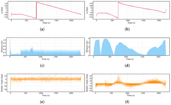In Figure 25, the collision avoidance tasks are conducted in calm water, and the ASV encounters a single dynamic obstacle in situations of head on, crossing 1, crossing 2, and overtaking separately. The position of the ASV and the obstacle is recorded per 150 s. Figure 26a shows the change in the distance between the ASV and each dynamic obstacle. The specific minimum distance values are presented in Table 6, and all of the minimum distances are above 40 m.