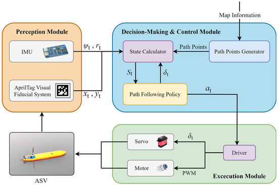 Model tests are conducted in this section to evaluate the performance of our autonomous navigation method based on the path-following policy. As illustrated in Figure 18, the prototype system comprises a VLCC ship model, a perception module that incorporates an inertial measurement unit (IMU) and an AprilTag visual recognition system, a decision-making and control module that includes a path points generator, a state calculator, and a path-following policy, and an execution module including a driver, a servo, and a motor.