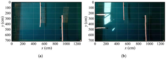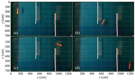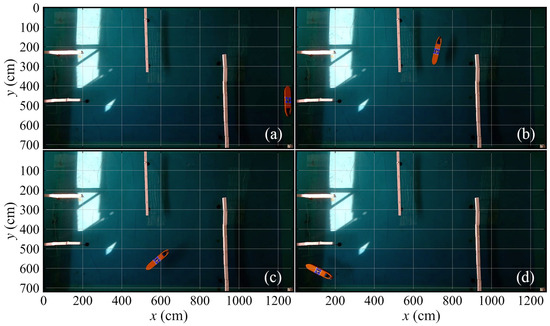 Figure 19 provides the overview of the two model test maps in a pool. In each map, we perform two model tests with different starting points and target points. At the beginning of each test, a series of guiding points are pre-determined, and the vessel is required to navigate along these points, with the propeller’s PWM set to 80. Taking test 1-2 and test 2-1 as examples, Figure 20 and Figure 21 separately present crucial navigation snapshots. In Figure 20a, the ASV just starts its navigation, in Figure 20b,c, it successfully avoids obstacles around the bend, and in Figure 20d, the ASV reaches its target point. In addition, the ASV is in the initial navigation stage in Figure 21a, and in Figure 21b, it bypasses the obstacle. Then, the ASV gradually approaches its destination and achieves the destination, as shown in Figure 21d.