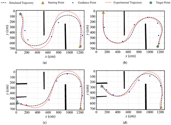 Comparisons between experimental trajectory and simulated trajectory. (a) Test 1-1. (b) Test 1-2. (c) Test 2-1. (d) Test 2-2.