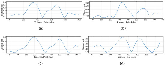 Distance errors between experimental trajectory and simulated trajectory. The x-axis denotes the index of experimental trajectory points. (a) Test 1-1. (b) Test 1-2. (c) Test 2-1. (d) Test 2-2.