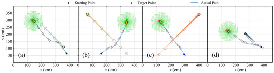 Crucial navigation snapshots of test 2-1 in map 2. (a) Initial status. (b) During the navigation. (c) During the navigation. (d) Final stage.