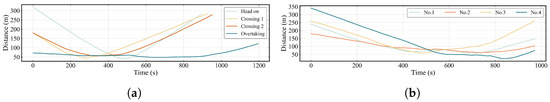 The variation in distance between the vessel and obstacles. (a) Single dynamic obstacle in different encounter scenarios. (b) Multiple dynamic obstacles scenario.
